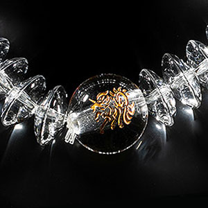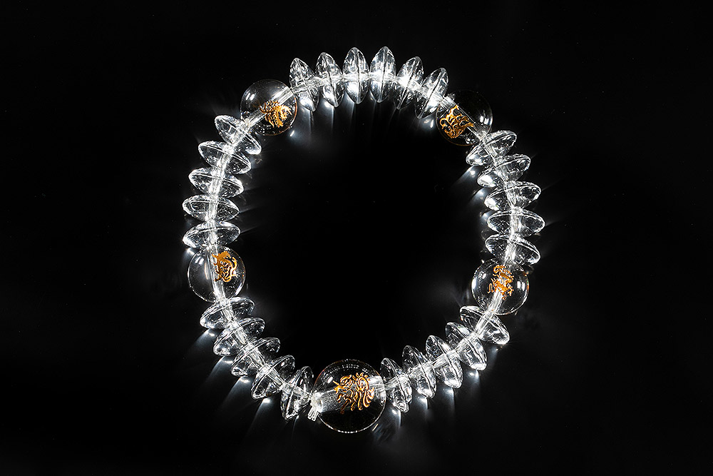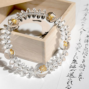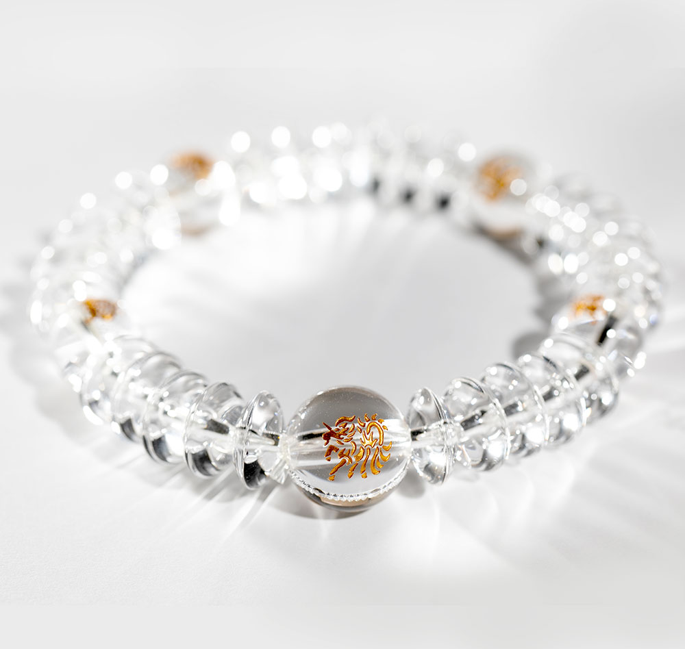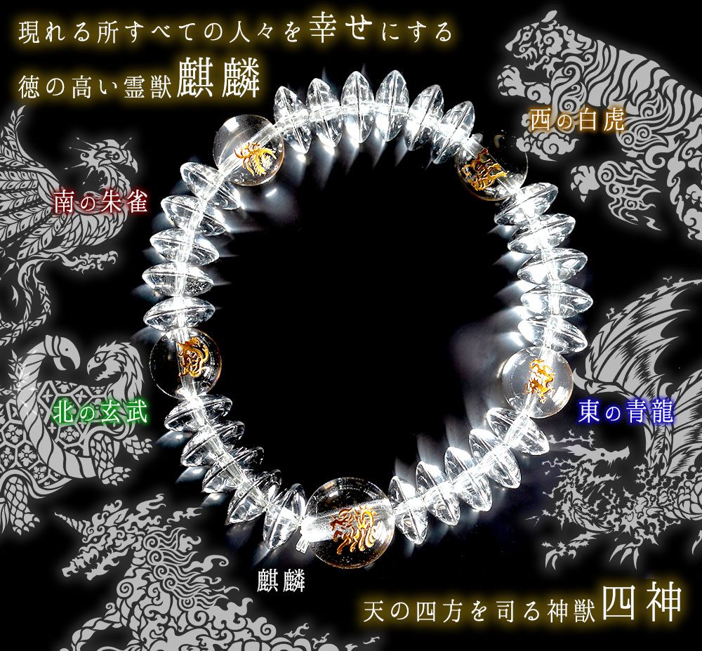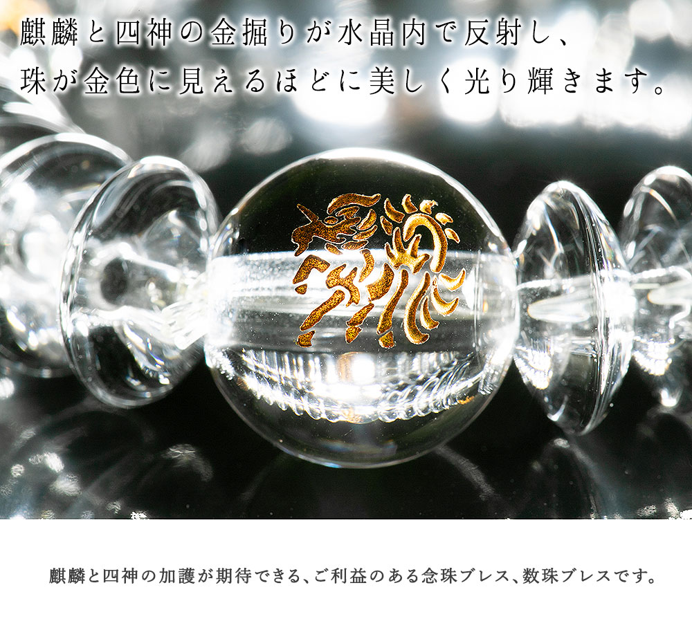 現れる所すべての人々を幸せにする徳の高い霊獣「麒麟」と、天の四方を司る神獣「四神」の美しい念珠ブレス。ゴールドの掘りが水晶内で反射し、珠が金色に見えるほどに美しく光り輝きます。