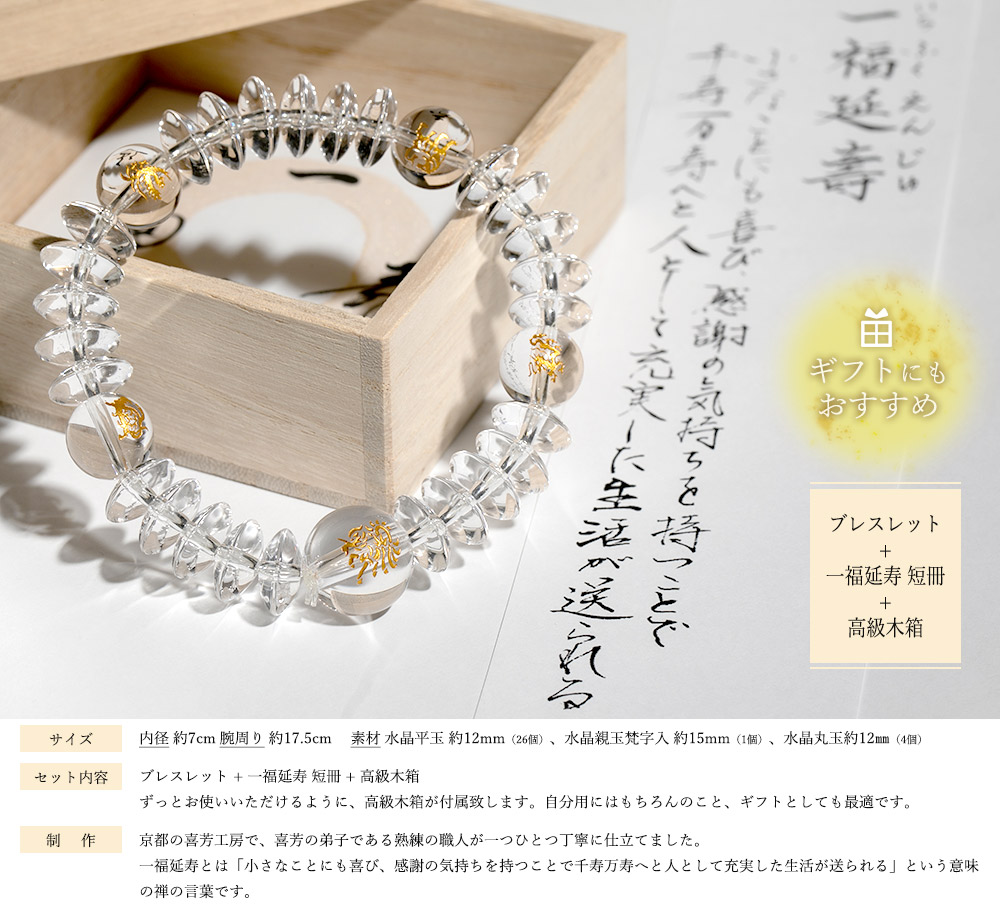 セット内容:ブレスレット + 一福延寿 短冊 + 高級木箱  ずっとお使いいただけるように、高級木箱が付属致します。自分用にはもちろんのこと、ギフトとしても最適です。